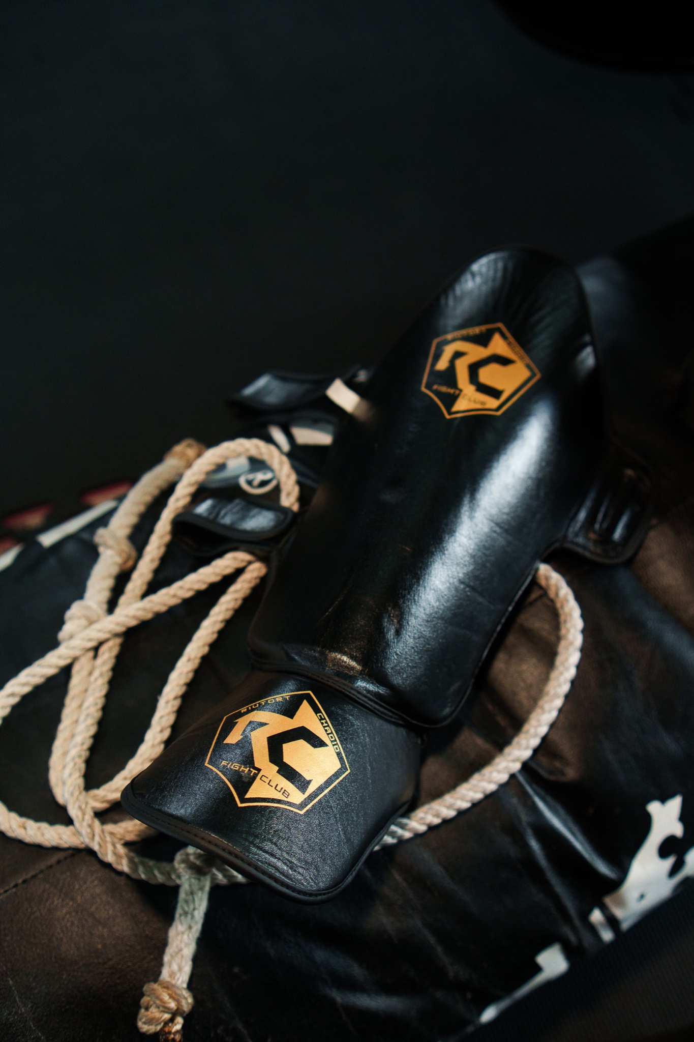 Espinilleras de cuero negro con logo dorado. Protección profesional para Muay Thai y K-1.