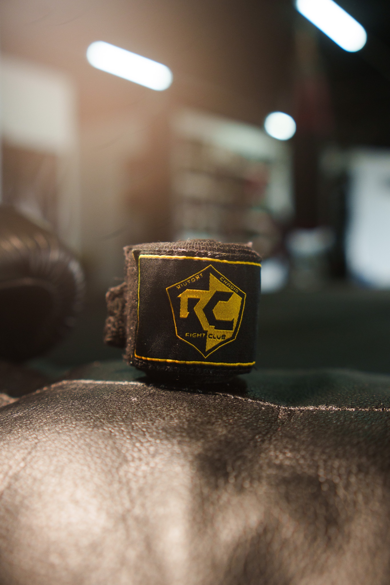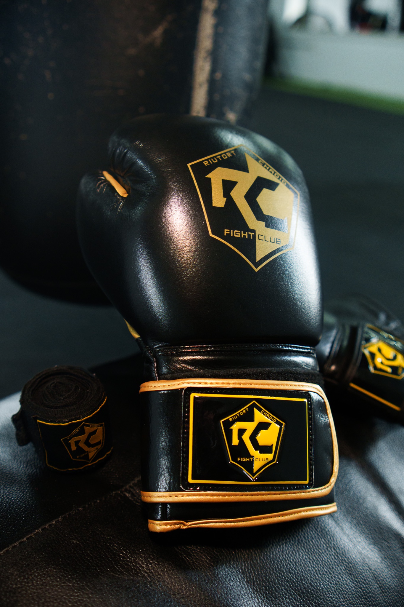 Vendas de mano negras con logo RC dorado. Protección esencial para cada entrenamiento.